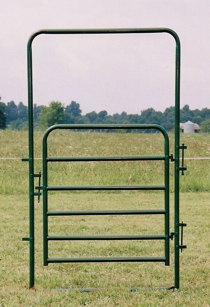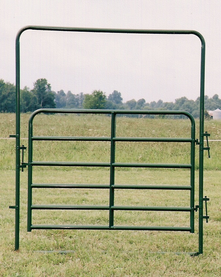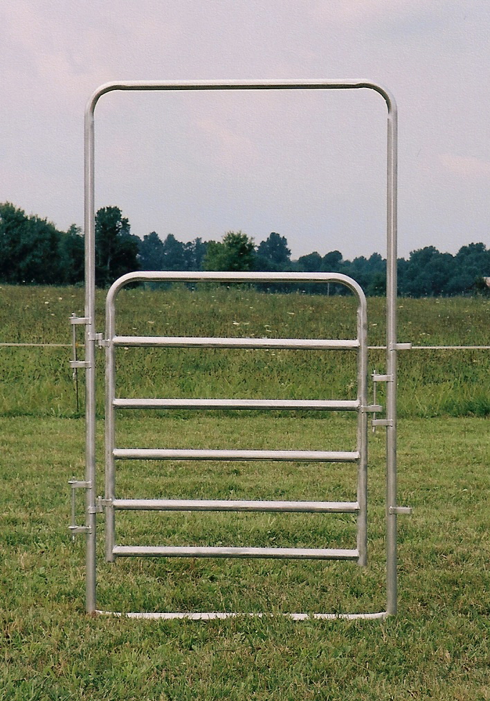Strenghtening braces is done by folding the edges and bending into Z-shape. Hinges are welded. Both Arch and Gate have rounded corners, easy access with corral system, easy entry with Dual Stamp Pin System, & Heavy Duty Hardware, additonal weld support to Arch in 8' and 10' lengths.